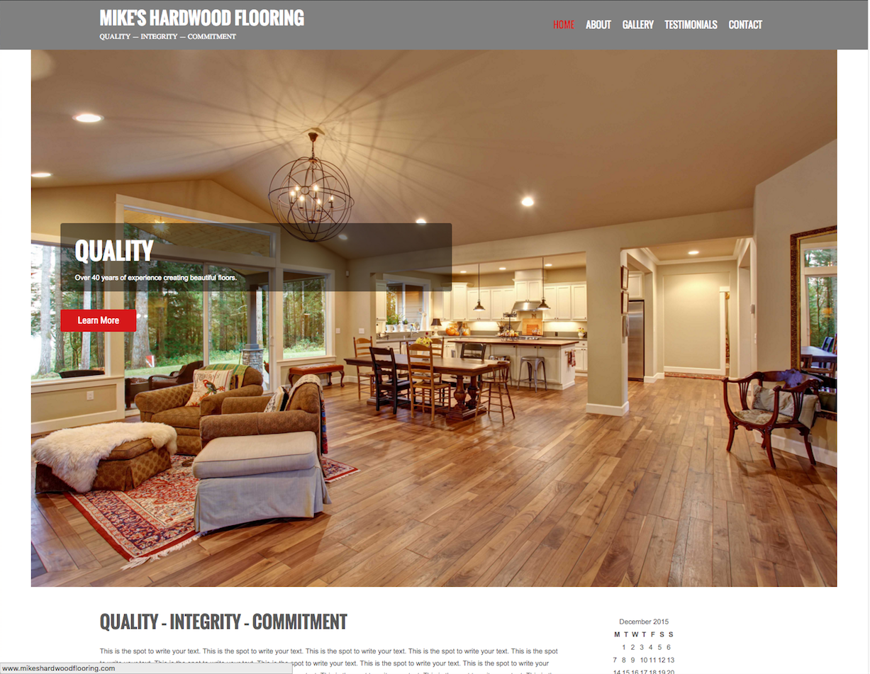This hardwood flooring site was designed to showcase beautiful upscale homes with the hardwood floor taking center stage. Home page slider uploads three lovely homes that integrate “Quality / Integrity / Commitment” transparent banners. Used widgets, plugins, galleries and stock photography.