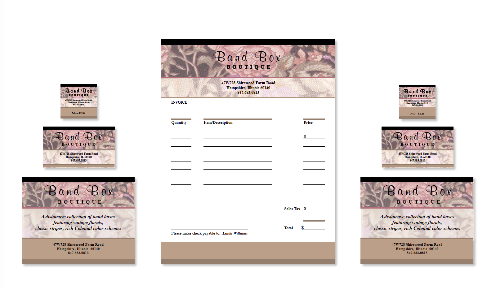 Created branding package for a startup boutique company, which features a distinctive collection of hat boxes in vintage florals, classic stripes and rich Colonial color schemes.