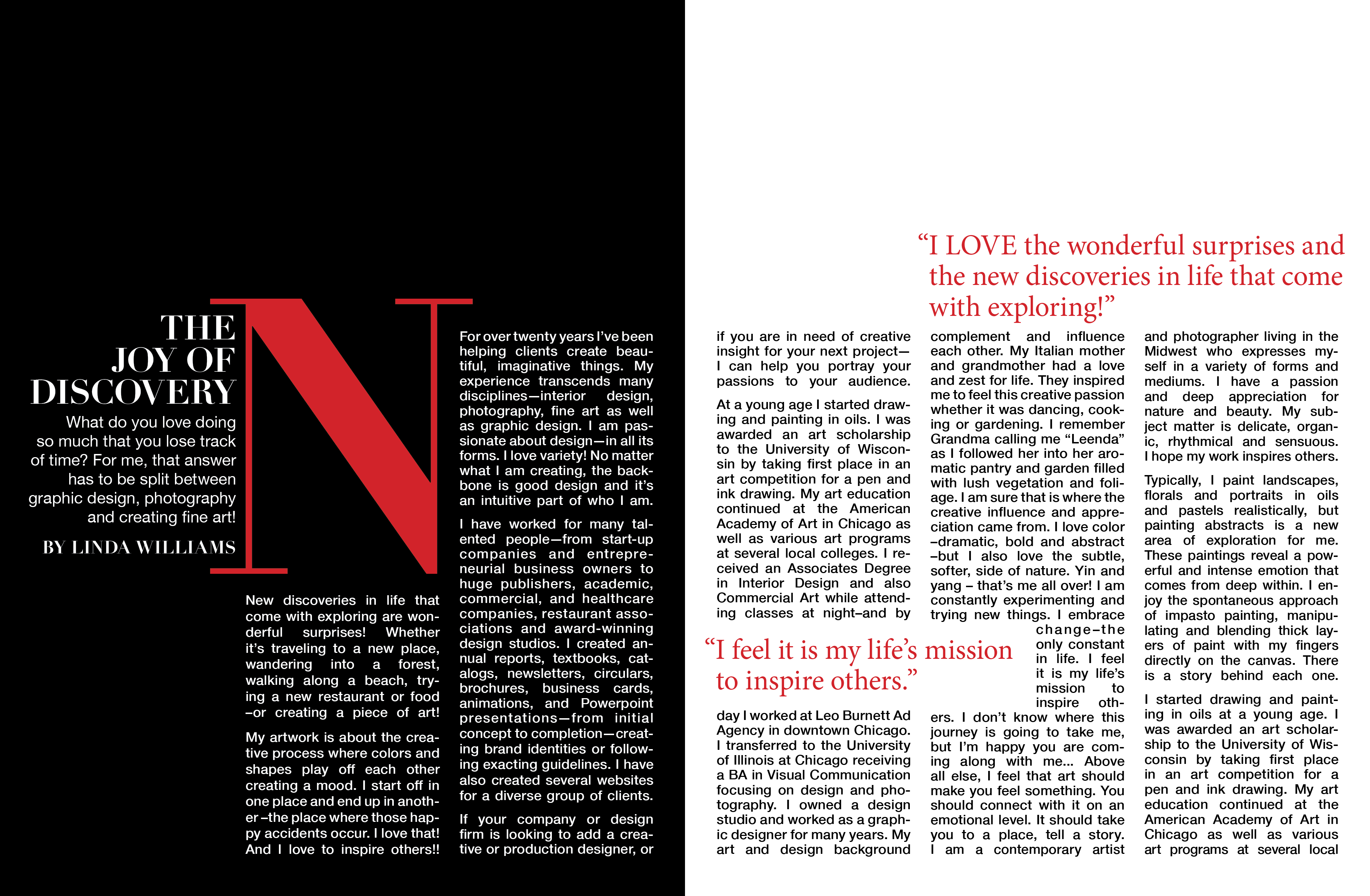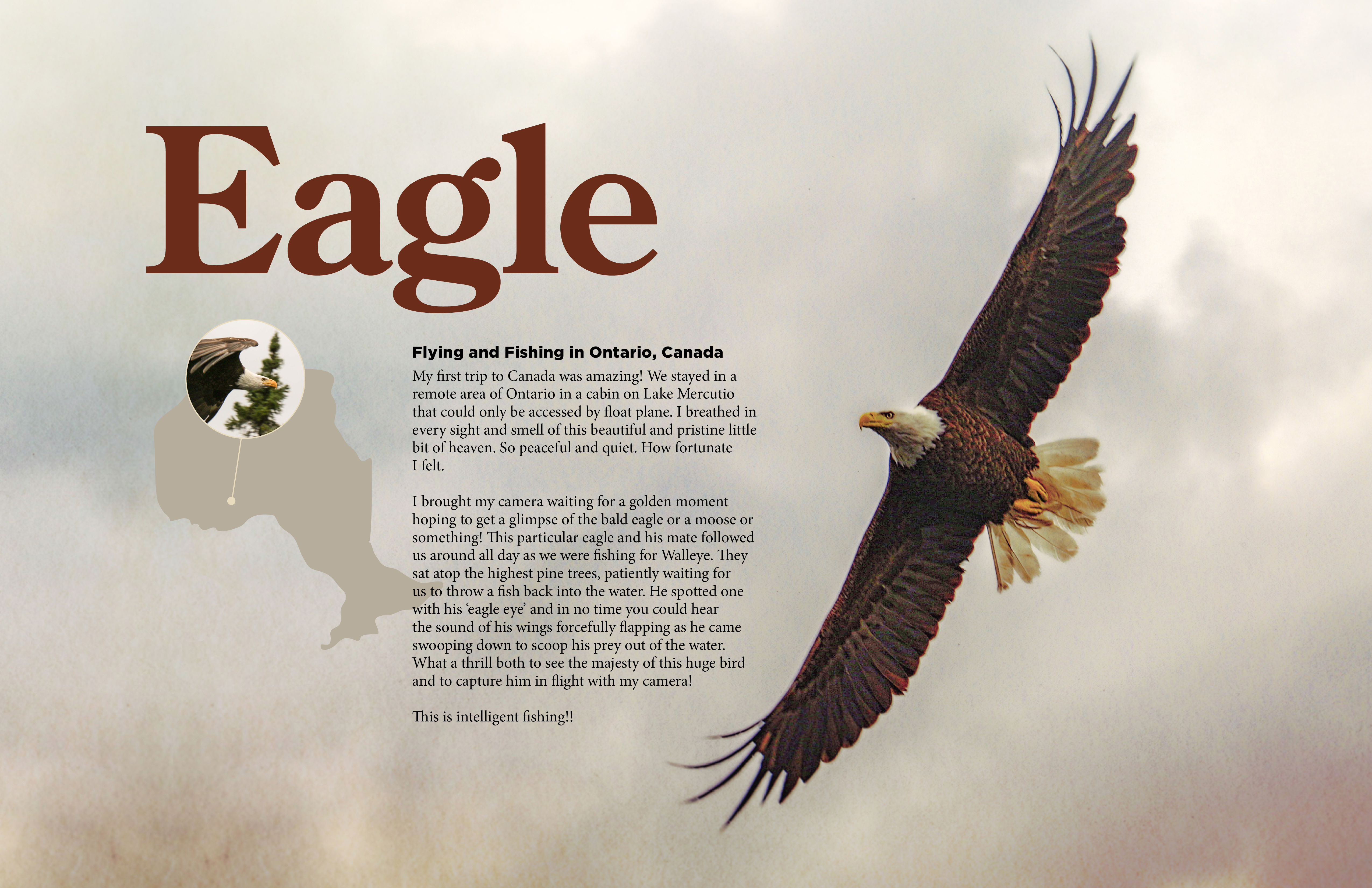 The design concept here was to give the eagle plenty of room on the page, no borders (or rectangles) to box it in, just airy clouds in the background. No box around the map and text is ragged on right side, not justified. Colors for the type and map were taken from the eagle so it all pulls together. I did a lot of image manipulation so you could see all the details on the feathers under him. Really enjoyed the trip and taking the photos of this bald eagle and its mate!