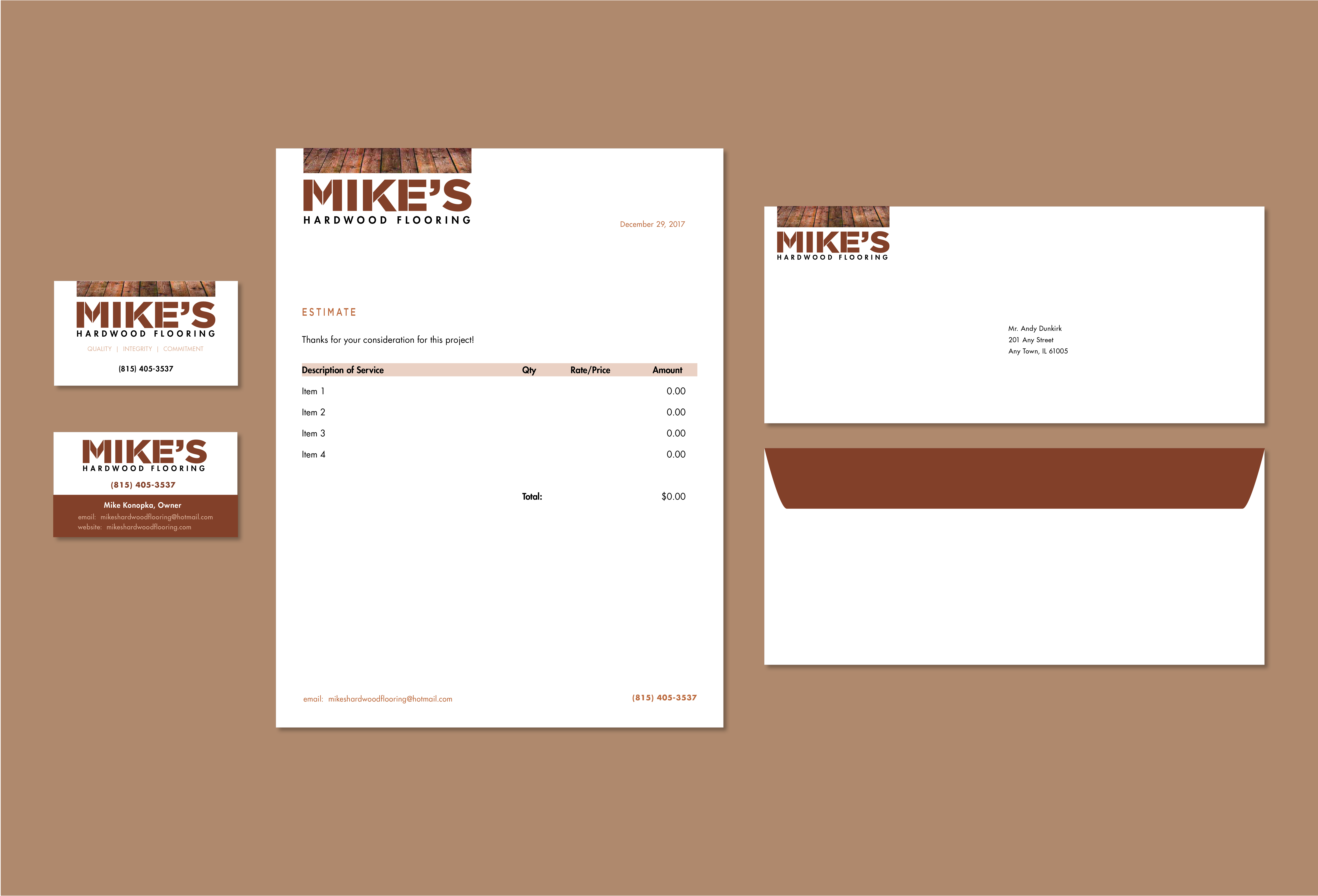 Created logo using strong, solid typeface made to look like flooring. Pulled color of floor throughout.