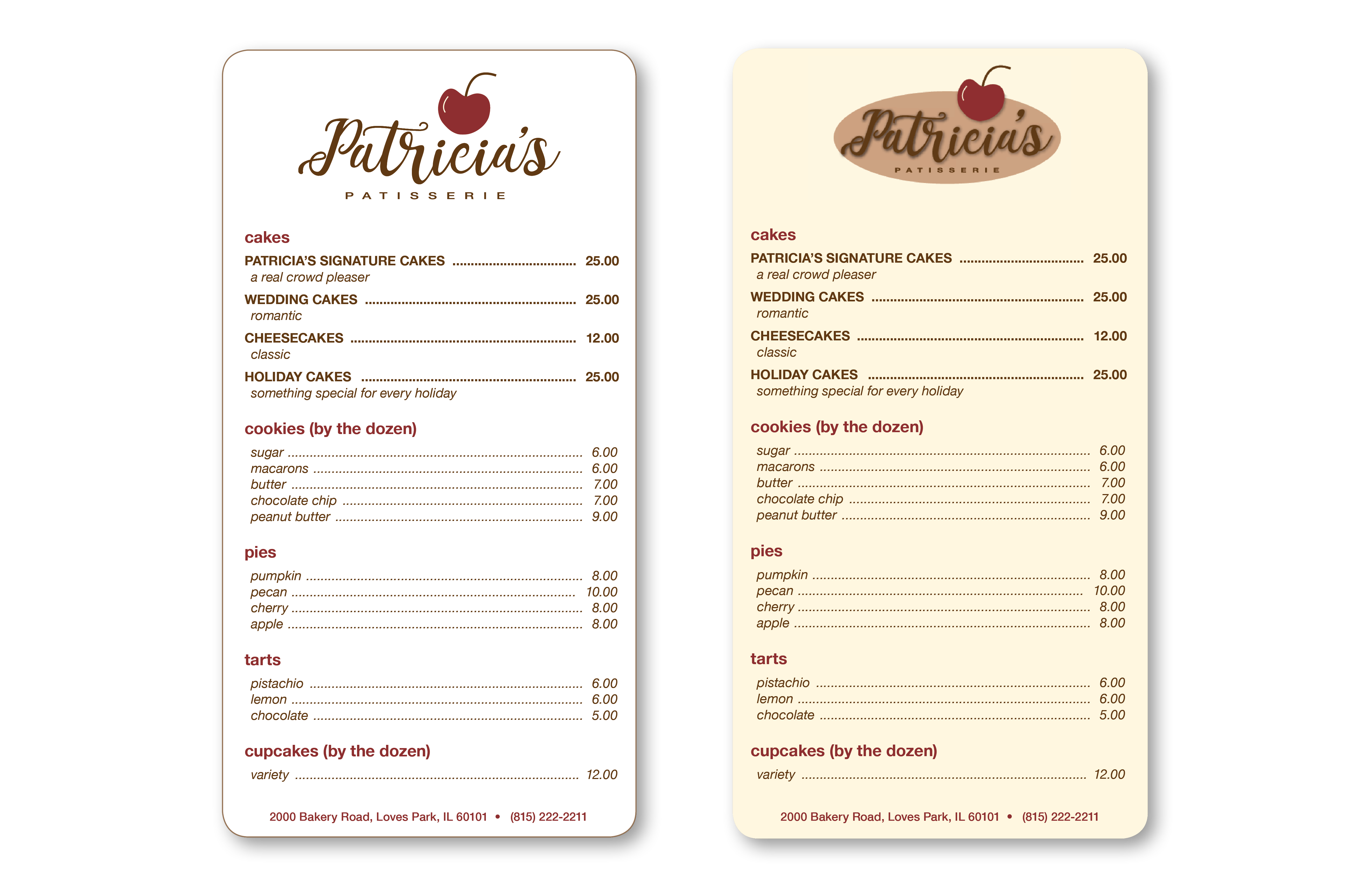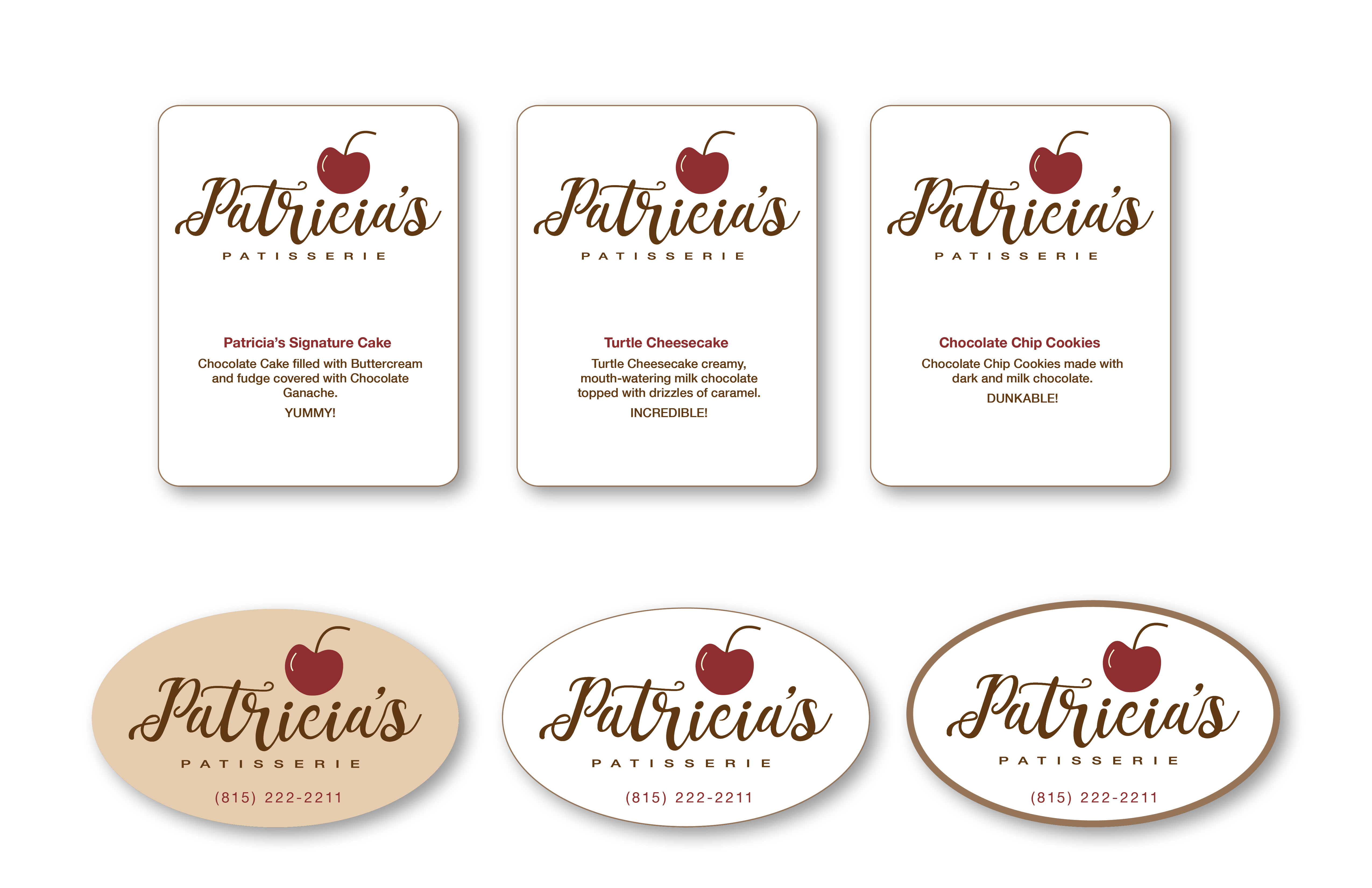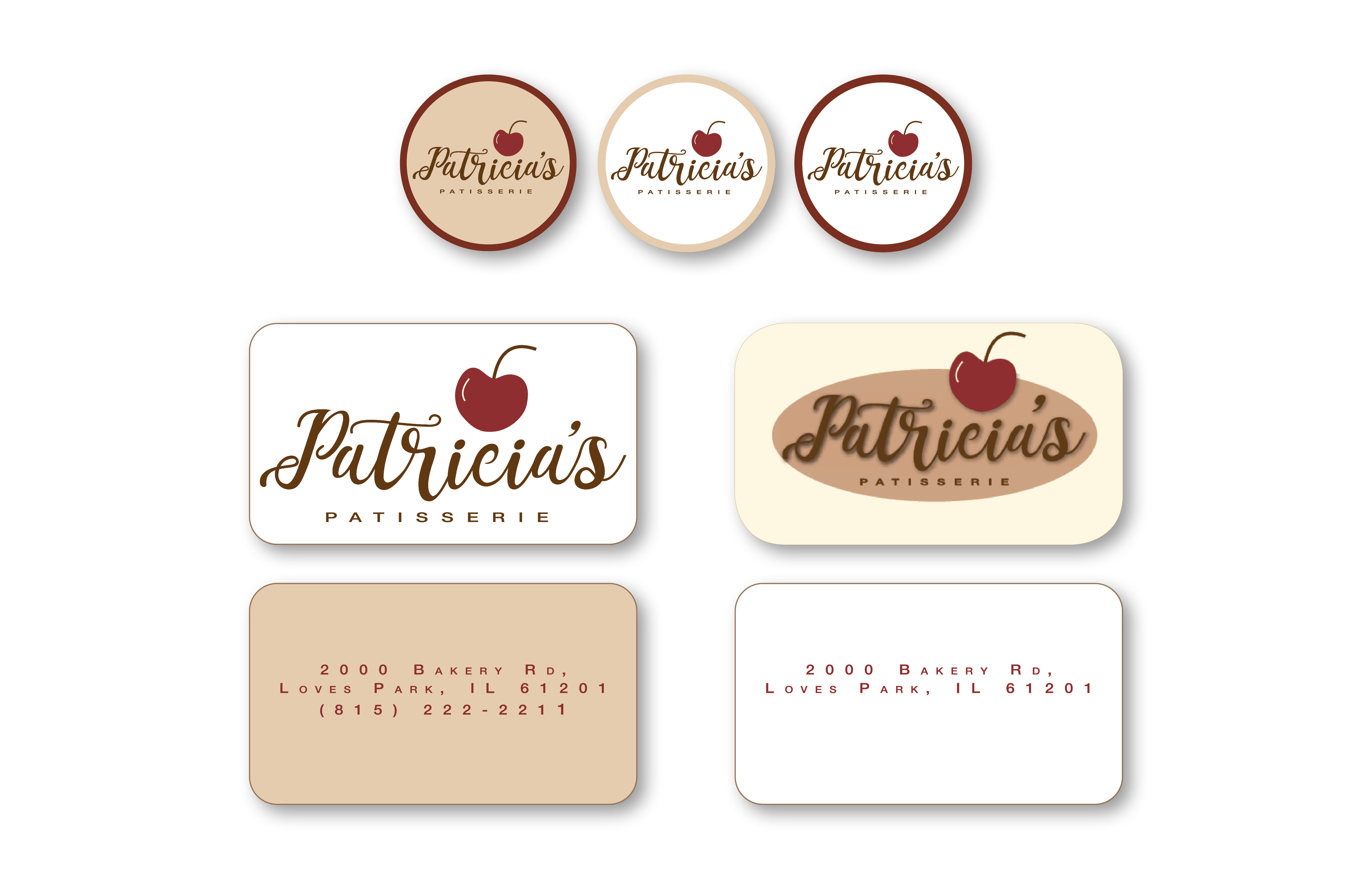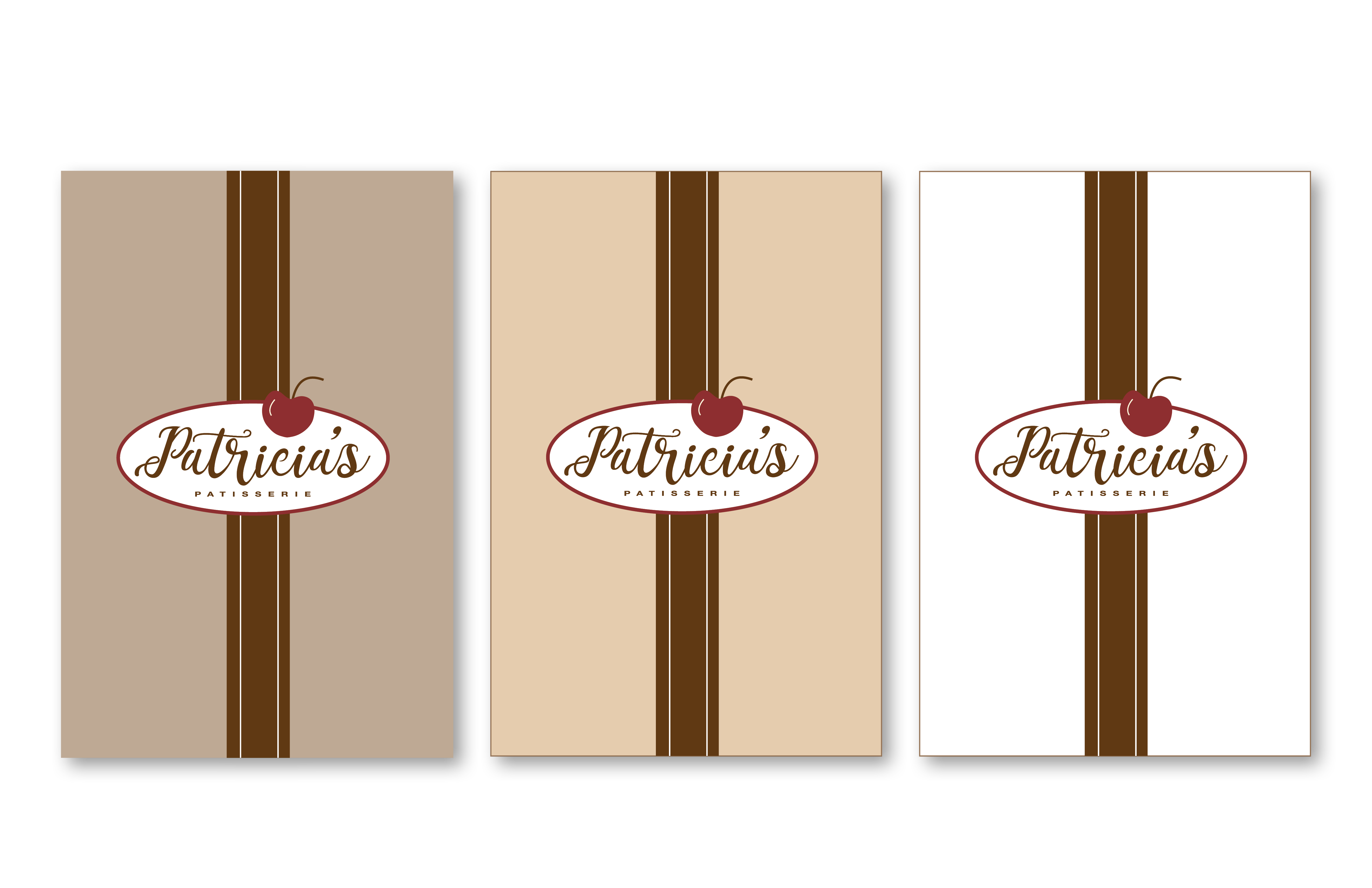 Created logo using typeface that suggests piped frosting on a cake. Chose color palette based on maple, chocolate and cherry pastries. Designed branding package to set Patricia’s Patisserie apart from other bakeries in the area. Included are options for this startup company to choose from.